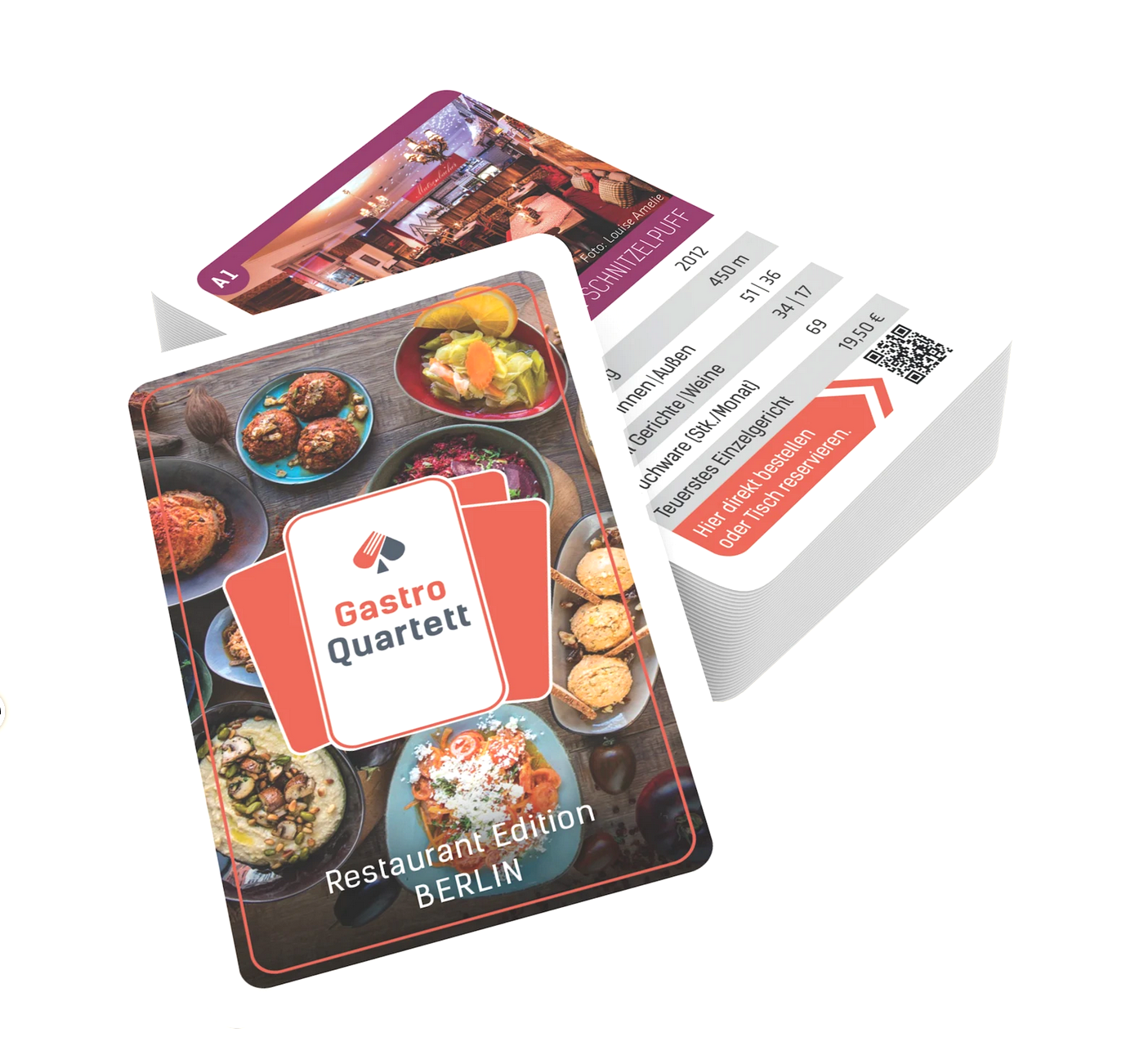 Kindheitserinnerungen an Quartettspiele oder die klassischen Autokarten werden wach. 32 Restaurants aller Kategorien sind vertreten – ein bunter Mix aus Sterneküchen, Szenelokalen, internationalen Länderküchen, Kiez Cafés und vielem mehr, führt uns lecker und bunt durch die Hauptstadt. Praktisch: direkt beim Spielen kann man per QR Code und Smartphone in den Lokalen Essen bestellen oder sich einen Tisch reservieren. Guten Appetit!